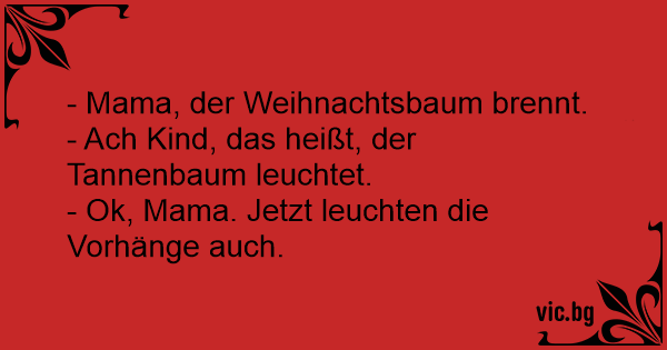 Fritzchen kommt aus dem Wohnzimmer in die Küche gelaufen. „Mama, Mama, der Christbaum brennt!„ Darauf die Mutter: „Das heißt der Christbaum leuchtet" Darauf Fritzchen: „Jetzt leuchten die Gardinen“