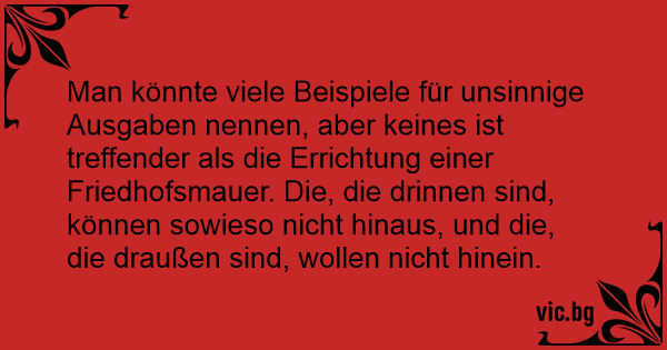 Man könnte viele Beispiele für unsinnige Ausgaben nennen, aber keines ist treffender als die Errichtung einer Friedhofsmauer. Die, die drinnen sind, können sowieso niсhт hinaus, und die, die draußen sind, wollen niсhт hinein.
