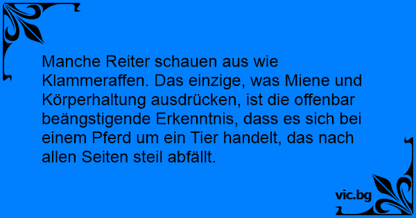 Manche Reiter schauen aus wie Klammeraffen. Das einzige, was Miene und Körperhaltung ausdrücken, ist die offenbar beängstigende Erkenntnis, dass es sich bei einem Pferd um ein Tier handelt, das nach allen Seiten steil abfällt.