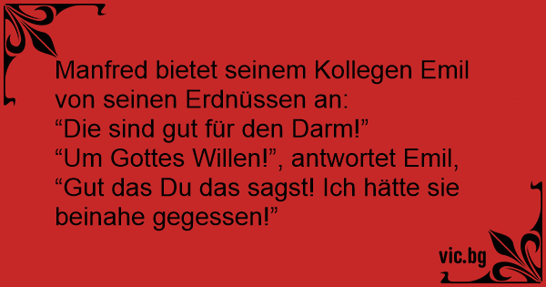Manfred bietet seinem Kollegen Emil von seinen Erdnüssen an: “Die sind gut für den Darm!” “Um Gottes Willen!”, antwortet Emil, “Gut das Du das sagst! Ich hätte sie beinahe gegessen!”
