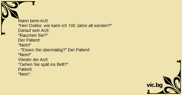 Jeg vil gerne blive 100 år. - Doktor, jeg vil gerne blive 100 år. - Ryger De? - Nej. - Drikker De? - Aldrig. - Hmm, spiller De kort, kører De for stærkt, vælter De Dem i kvinder? -...