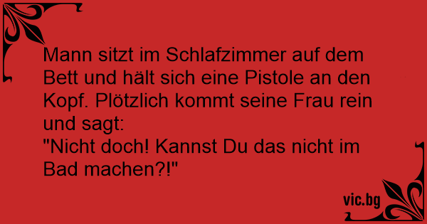 Mann sitzt im Schlafzimmer auf dem Bett und hält sich eine Pistole an den Kopf. Plötzlich kommt seine Frau rein und sagt: