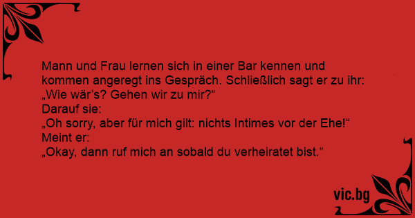 Mann und Frau lernen sich in einer Bar kennen und kommen angeregt ins Gespräch. Schließlich sagt er zu ihr: