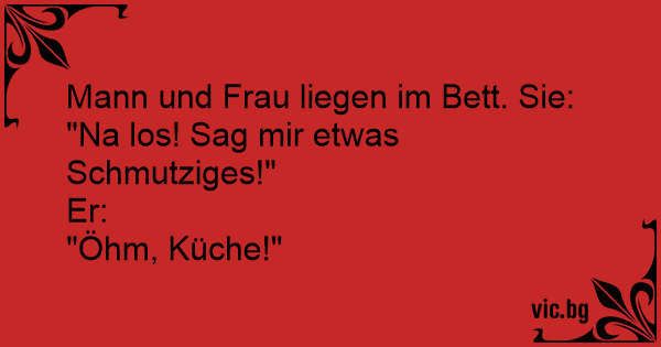 Ein Pärchen beim Sex. Sie fängt an zu stöhnen: „Jaa, gib’s mir. Sag mir dreckige Sachen!“ Er: „Küche, Bad, Wohnzimmer …“