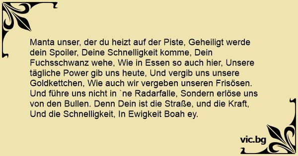 Manta unser, der du heizt auf der Piste, Geheiligt werde dein Spoiler, Deine Schnelligkeit komme, Dein Fuchsschwanz wehe, Wie in Essen so auch hier, Unsere tägliche Power gib uns heute, Und vergib uns unsere Goldkettchen, Wie auch wir vergeben unseren Frisösen.