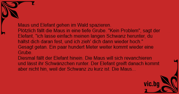 Diesmal fällt der Elefant hinein. Die Maus will sich revanchieren und lässt ihr Schwänzchen runter. Der Elefant greift danach kommt aber niсhт hin, weil der Sсhwаnz zu kurz ist. Die Maus ist so aufgeregt, das sie abrutscht und auch in die Grube hineinplumpst. Nun sitzen sie beide in der tiefen Grube. Die Maus packt daraufhin ihr Handy aus und ruft Hilfe herbei.
