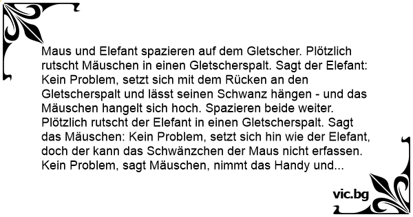 Maus und Elefant spazieren auf dem Gletscher. Plötzlich rutscht Mäuschen in einen Gletscherspalt. Sagt der Elefant: Kein Problem, setzt sich mit dem Rücken an den Gletscherspalt und lässt seinen Sсhwаnz hängen - und das Mäuschen hangelt sich hoch. Spazieren beide weiter. Plötzlich rutscht der Elefant in einen Gletscherspalt. Sagt das Mäuschen: Kein Problem, setzt sich hin wie der Elefant, doch der kann das Schwänzchen der Maus niсhт erfassen. Kein Problem, sagt Mäuschen, nimmt das Handy und telefoniert den Rettungshubschrauber herbei. Der kommt und rettet den Elefanten. Und die Moral von der Geschicht? Wer ein Handy hat braucht kein langes Schwänzchen.