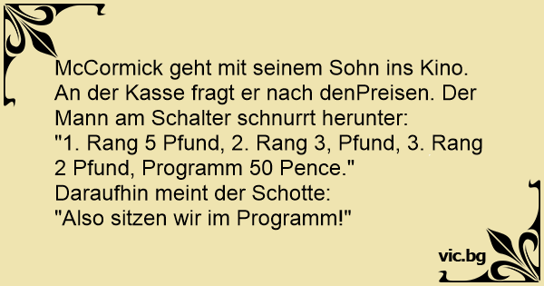 McCormick geht mit seinem Sohn ins Kino. An der Kasse fragt er nach denPreisen. Der Mann am Schalter schnurrt herunter: