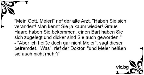 "Mein Gott, Meier!" rief der alte Arzt. "Haben Sie sich verändert! Man kennt Sie ja kaum wieder! Graue Haare haben Sie bekommen, einen Bart haben Sie sich zugelegt und dicker sind Sie auch geworden."