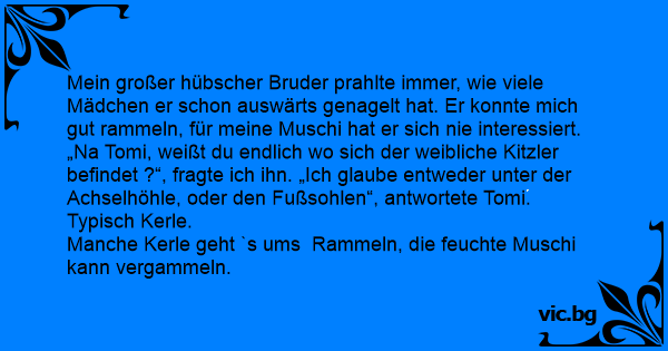 Mein großer hübscher Bruder prahlte immer, wie viele Mädchen er schon auswärts genagelt hat. Er konnte mich gut rammeln, für meine Мusсhi hat er sich nie interessiert. „Na Tomi, weißt du endlich wo sich der weibliche Kitzler befindet ?“, fragte ich ihn. „Ich glaube entweder unter der Achselhöhle, oder den Fußsohlen“, antwortete Tomi. Typisch Kerle. Manche Kerle geht `s ums Rammeln, die feuchte Мusсhi kann vergammeln.