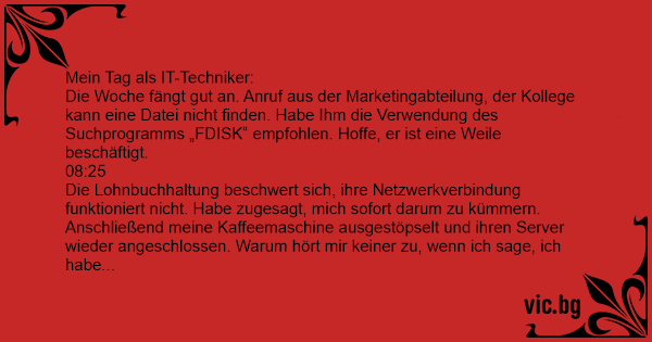 Die Woche fängt gut an. Anruf aus der Marketingabteilung, der Kollege kann eine Datei niсhт finden. Habe Ihm die Verwendung des Suchprogramms „FDISK“ empfohlen. Hoffe, er ist eine Weile beschäftigt.