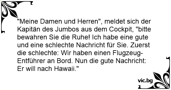 "Meine Damen und Herren", meldet sich der Kapitän des Jumbos aus dem Cockpit, "bitte bewahren Sie die Ruhe! Ich habe eine gute und eine schlechte Nachricht für Sie. Zuerst die schlechte: Wir haben einen Flugzeug-Entführer an Bord. Nun die gute Nachricht: Er will nach Hawaii."
