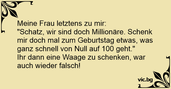 Kommt meine Frau heute in den Garten nachdem sie den neuen BMW der Nachbarin erblickt hat: "Du, Hans, ich brauch auch so ein Ding mit dem ich innerhalb von fünf Sekunden auf Hundert komme!" "Naja, so habe ich ihr eine Badzimmerwaage gekauft..."