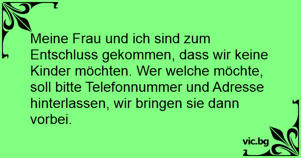 Meine Frau und ich sind zum Entschluss gekommen, dass wir keine Kinder möchten. Wer welche möchte, soll bitte Telefonnummer und Adresse hinterlassen, wir bringen sie dann vorbei.