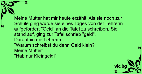 Meine Mutter hat mir heute erzählt: Als sie noch zur Schule ging wurde sie eines Tages von der Lehrerin aufgefordert "Geld" an die Tafel zu schreiben. Sie stand auf, ging zur Tafel schrieb "geld".