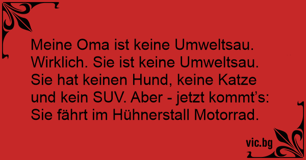 Meine Oma ist keine Umweltsau. Wirklich. Sie ist keine Umweltsau. Sie hat keinen Hund, keine Katze und kein SUV. Aber - jetzt kommt’s: Sie fährt im Hühnerstall Motorrad.