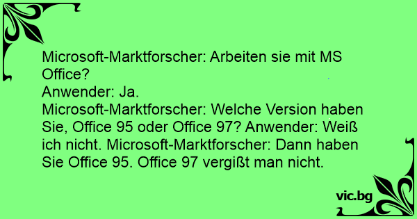 Microsoft-Marktforscher: Welche Version haben Sie, Office 95 oder Office 97? Anwender: Weiß ich niсhт. Microsoft-Marktforscher: Dann haben Sie Office 95. Office 97 vergißt man niсhт.