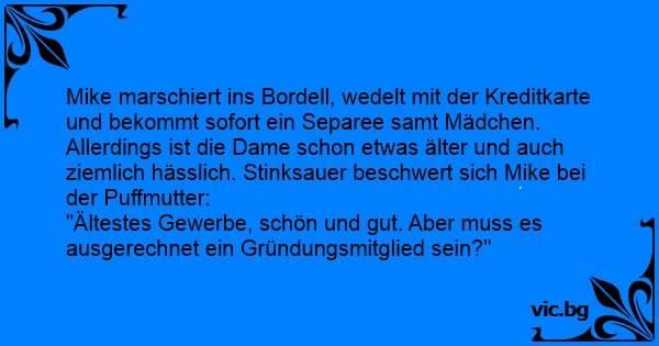 Mike marschiert ins Bordell, wedelt mit der Kreditkarte und bekommt sofort ein Separee samt Mädchen. Allerdings ist die Dame schon etwas älter und auch ziemlich hässlich. Stinksauer beschwert sich Mike bei der Puffmutter: