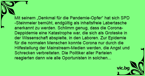 Mit seinem „Denkmal für die Pandemie-Opfer“ hat sich SPD-Steinmeier bemüht, endgültig als inhaltsfreie Labertasche anerkannt zu werden. Schlimm genug, dass die Corona-Deppidemie eine Katastrophe war, die sich als Groteske in der Wissenschaft abspielte, in den Laboren. Zur Epidemie für die normalen Menschen konnte Corona nur durch die Hilfestellung der Mainstream-Medien werden, die Angst und Schrecken verbreiteten. Die Politiker aller Parteien reagierten dann wie alle Oportunisten in solchen Fällen - sie schlossen sich aus Feigheit dem Meinstream an, statt selbst die Opferzahlen kritisch zu hinterfragen, und schon gab es die Corona-Maßnahmen für die Pandemie, die nunmehr auch politisch von der Labor-Pandemie zur Laber-Pandemie avancierte, d. H. es wurde solange dummes Zeug gelabert, bis das ganze Land den verheerenden Lockdown verordnet bekam infolge von Verkennung der Tatssachen und vor allem infolge von Demokratieversagen. Man hätte nur auf die vielen kritischen Stimmen von klügeren Fachleuten hören müssen als es die Scheuklappen-tragenden Fachleute der profitorientierten Impf-Industrie sind. Diese RKI-„Wissenschaftler“ mit Herrn Drosten an der Spitze haben schon die Schweinegrippe an die Wand gefahren und dem deutschen Steuerzahler durch genau dieselbe Art von „Irrtümern“ fast 700 Millionen sinnlose Impfstoff-Kosten beschert. Langsam bekommen sogar die Leit-Medien mit, dass es sich bei Covid-19 ZUM WIEDERHOLTEN MAL um eine Labor-Pandemie handelt statt um eine landesweite Katastrophe. Erst die verrückten Maßnahmen machten und machen immer noch eine echte Katastrophe daraus. Denn es gibt mitlerweile weder Corona-Tote noch wirklich Corona-Erkrankte, lediglich ganz wenige Neu-Infizierte, welche sogar im Rahmen der Fehlerquelle der PCR-Tests liegen. Und jetzt kommt dieser SPD-Meier und will einen GedenkSTEIN in unser Bewusstsein setzen, ein Denkmal für die angeblich 9000 deutschen Corona-Opfer. Der Steinmeier ist niсhт ganz bei Sinnen. Zumindest der Gerechtigkeiotssinn fehlt ihm. Dennn sonst müsste er für die weit größere Anzahl der Influenza-Opfer schon lange solche Steinmeier-Denkmäler gefordert haben. Тuт er aber niсhт, weil es schon Impfstoffe gegen Influenza gibt, da ist die Impf-Industrie bereits sehr gut im Geschäft. Ist dieser SPD-Steinmeier etwa eine Marionette von Big Pharma und Bill Gates? Und die Frau mit der Raute zwischen Daumen und Zeigefinger? Sagte die niсhт auch - erst wenn es einen Impfstoff gibt, können wir die Maßnahmen aufheben? Kanzlerin und Bundespräsident als Handlanger der Impf-Industrie wollen wie bei der Schweinegrippe wieder 700 Millionen Euro Steuergelder veruntreuen - diesmal sicher noch mehr? Ich konstatiere: die Demokratie in meinem geliebten Heimatland ist ein WITZ !! Es darf jetzt darüber geweint werden… Das Lachen besorgen derweil die Fädenzieher mit Bill Gates an der Spitze