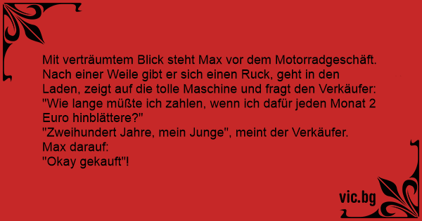 Mit verträumtem Blick steht Max vor dem Motorradgeschäft. Nach einer Weile gibt er sich einen Ruck, geht in den Laden, zeigt auf die tolle Maschine und fragt den Verkäufer: