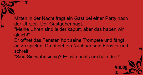 Mitten in der Nacht fragt ein Gast bei einer Party nach der Uhrzeit. Der Gastgeber sagt: