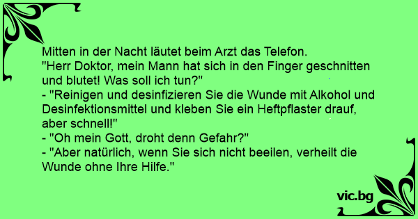 "Herr Doktor, mein Mann hat sich in den Finger geschnitten und blutet! Was soll ich tun?"