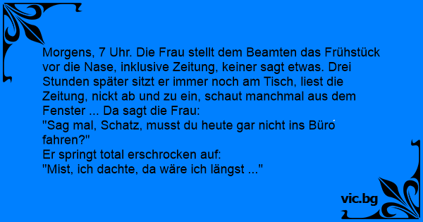 Morgens, 7 Uhr. Die Frau stellt dem Beamten das Frühstück vor die Nase, inklusive Zeitung, keiner sagt etwas. Drei Stunden später sitzt er immer noch am Tisch, liest die Zeitung, nickt ab und zu ein, schaut manchmal aus dem Fenster ... Da sagt die Frau: