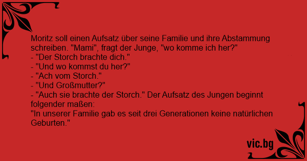 Moritz soll einen Aufsatz über seine Familie und ihre Abstammung schreiben. "Mami", fragt der Junge, "wo komme ich her?"