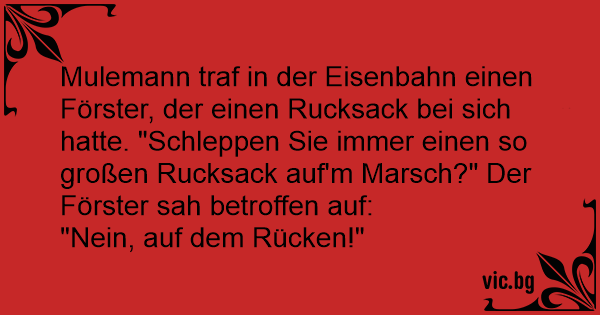 Mulemann traf in der Eisenbahn einen Förster, der einen Rucksack bei sich hatte. "Schleppen Sie immer einen so großen Rucksack auf'm Marsch?" Der Förster sah betroffen auf: