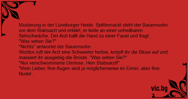 Musterung in der Lüneburger Heide. Splitternackt steht der Bauernsohn vor dem Stabsarzt und erklärt, er leide an einer unheilbaren Sehschwäche. Der Arzt ballt die Hand zu einer Faust und fragt:
