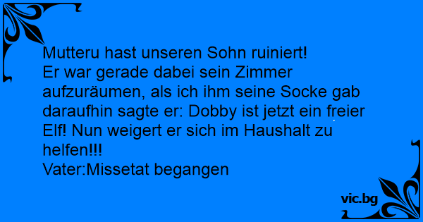 Er war gerade dabei sein Zimmer aufzuräumen, als ich ihm seine Socke gab daraufhin sagte er: Dobby ist jetzt ein freier Elf! Nun weigert er sich im Haushalt zu helfen!!!