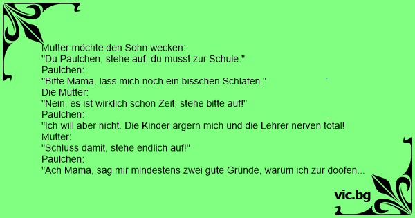 Hallo meine lieben Witzeschreiber und Witzeleser, ich habe wie jeden Sonntag einen neuen Witz im Gepäck. Hir ist der Witz: Die Mutter weckt am Morgen ihren Sohn. Spricht die Mutter: „Paulchen, du...