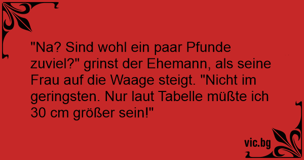 "Na? Sind wohl ein paar Pfunde zuviel?" grinst der Ehemann, als seine Frau auf die Waage steigt. "Niсhт im geringsten. Nur laut Tabelle müßte ich 30 cm größer sein!"