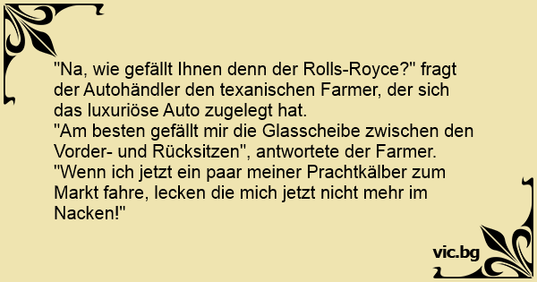 "Na, wie gefällt Ihnen denn der Rolls-Royce?" fragt der Autohändler den texanischen Farmer, der sich das luxuriöse Auto zugelegt hat.