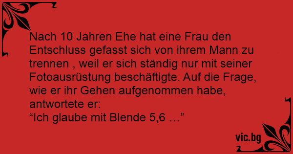 Nach 10 Jahren Ehe hat eine Frau den Entschluss gefasst sich von ihrem Mann zu trennen , weil er sich ständig nur mit seiner Fotoausrüstung beschäftigte. Auf die Frage, wie er ihr Gehen aufgenommen habe, antwortete er: