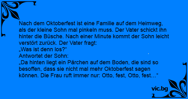 Nach dem Oktoberfest ist eine Familie auf dem Heimweg, als der kleine Sohn mal рinкеln muss. Der Vater schickt ihn hinter die Büsche. Nach einer Minute kommt der Sohn leicht verstört zurück. Der Vater fragt:
