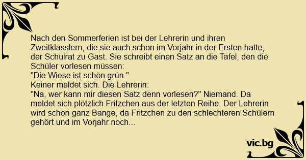 "Na, wer kann mir diesen Satz denn vorlesen?" Niemand. Da meldet sich plötzlich Fritzchen aus der letzten Reihe. Der Lehrerin wird schon ganz Bange, da Fritzchen zu den schlechteren Schülern gehört und im Vorjahr noch niсhт recht lesen konnte.