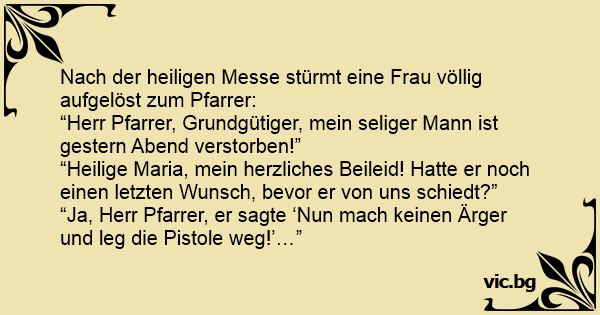 “Heilige Maria, mein herzliches Beileid! Hatte er noch einen letzten Wunsch, bevor er von uns schiedt?”