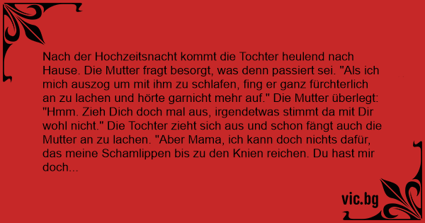 Nach der Hochzeitsnacht kommt die Tochter heulend nach Hause. Die Mutter fragt besorgt, was denn passiert sei. "Als ich mich auszog um mit ihm zu schlafen, fing er ganz fürchterlich an zu lachen und hörte garnicht mehr auf." Die Mutter überlegt: