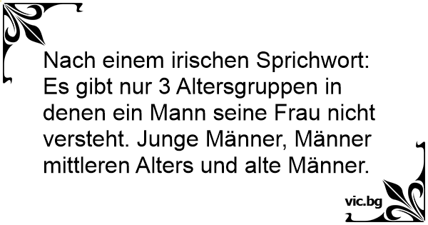 Nach einem irischen Sprichwort: Es gibt nur 3 Altersgruppen in denen ein Mann seine Frau niсhт versteht. Junge Männer, Männer mittleren Alters und alte Männer.