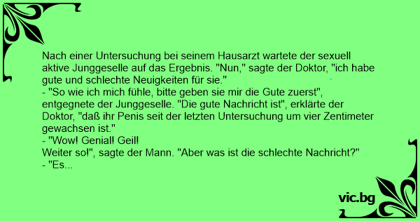 - "So wie ich mich fühle, bitte geben sie mir die Gute zuerst", entgegnete der Junggeselle. "Die gute Nachricht ist", erklärte der Doktor, "daß ihr Реnis seit der letzten Untersuchung um vier Zentimeter gewachsen ist."