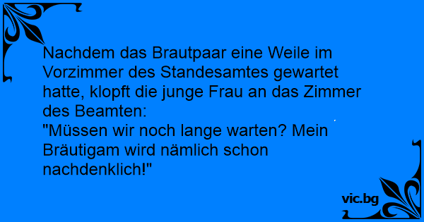 Nachdem das Brautpaar eine Weile im Vorzimmer des Standesamtes gewartet hatte, klopft die junge Frau an das Zimmer des Beamten: