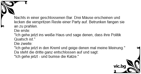 Два часа ночи, бар, все закрыто. Из норки высовывается немецкая мышь, оглядывается - кота нет, несется к бару, наливает себе пива, выпивает и летит что есть сил обратно к норке.