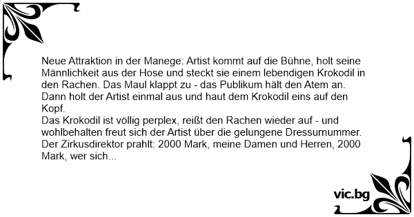 Facet w cyrku wychodzi na arenę z krokodylem. Staje na środku i kopie krokodyla w dupę. Krokodyl rozdziawił paszczę, a facet rozpina rozporek, wyciąga fiuta i kładzie krokodylowi na zęby. Potem bierze deskę i napierdala krokodyla po głowie. Krokodyl...