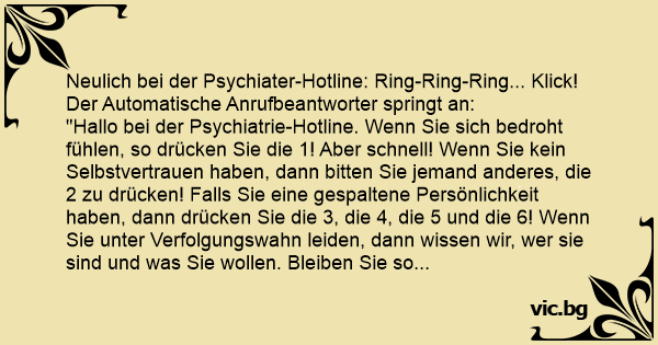 "Hallo bei der Psychiatrie-Hotline. Wenn Sie sich bedroht fühlen, so drücken Sie die 1! Aber schnell! Wenn Sie kein Selbstvertrauen haben, dann bitten Sie jemand anderes, die 2 zu drücken! Falls Sie eine gespaltene Persönlichkeit haben, dann drücken Sie die 3, die 4, die 5 und die 6! Wenn Sie unter Verfolgungswahn leiden, dann wissen wir, wer sie sind und was Sie wollen. Bleiben Sie so lange in der Leitung, bis wir den Anruf zurückverfolgt haben! Wenn Sie schizophren sind, dann hören Sie auf die Stimmen. Sie sagen Ihnen, welche Nummer Sie drücken müssen! Falls Sie manisch-depressiv sind spielt es keine Rolle, welche Nummer Sie drücken: Niemand hört Ihnen zu..."