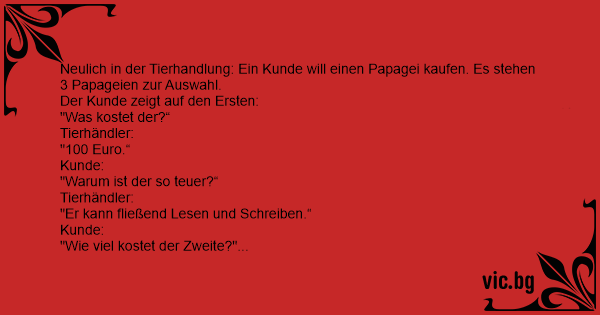 Ein Mann betritt eine Tierhandlung, um einen Papagei zu kaufen. Der Verkäufer zeigt die drei vorrätigen Exemplare. Der erste Papagei ist herrlich bunt, bildschön und 50 cm gross. "Na ja", denkt der Käufer, der wird wohl recht teuer sein. Er fragt den Verkäufer nach dem Preis: "1.000 Euro! Aber...