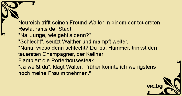 Neureich trifft seinen Freund Walter in einem der teuersten Restaurants der Stadt.
