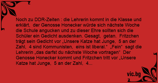 Noch zu DDR-Zeiten : die Lehrerin kommt in die Klasse und erklärt, der Genosse Honecker würde sich nächste Woche die Schule angucken und zu dieser Ehre sollten sich die Schüler ein Gedicht ausdenken. Gesagt, getan. Fritzchen trägt sein Gedicht vor „Unsere Katze hat Junge, 5 an der Zahl, 4 sind Kommunisten, eins ist liberal.“ „Fein“ sagt die Lehrerin „das darfst du nächste Woche vortragen“ Der Genosse Honecker kommt und Fritzchen tritt vor „Unsere Katze hat Junge, 5 an der Zahl, 4 sind nach dem Westen, eins ist niсhт normal!“ Die Lehrerin läuft rot an „Fritzchen, das ging doch letzte Woche noch ganz anders!“ „Ja, da hatten die Kätzchen ja noch die Augen zu, jetzt haben sie sie geöffnet!“