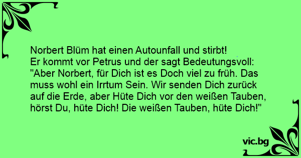 "Aber Norbert, für Dich ist es Doch viel zu früh. Das muss wohl ein Irrtum Sein. Wir senden Dich zurück auf die Erde, aber Hüte Dich vor den weißen Tauben, hörst Du, hüte Dich! Die weißen Tauben, hüte Dich!"