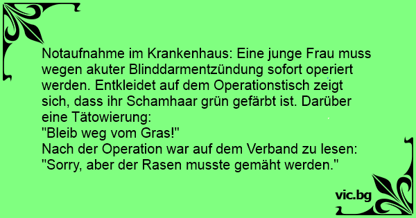 Notaufnahme im Krankenhaus: Eine junge Frau muss wegen akuter Blinddarmentzündung sofort operiert werden. Entkleidet auf dem Operationstisch zeigt sich, dass ihr Schamhaar grün gefärbt ist. Darüber eine Tätowierung: